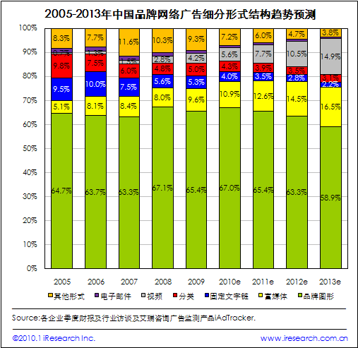 2009年,在中國(guó)網(wǎng)絡(luò)廣告各細(xì)分形式中,視頻廣告市場(chǎng)規(guī)模為5.7億元,雖然其市場(chǎng)份額僅為2.8%,但是其同比增速遠(yuǎn)超其他細(xì)分形式,高達(dá)72.0%;而富媒體廣告也表現(xiàn)不俗,增速達(dá)37.5%,其市場(chǎng)份額由2008年的5.7%上升至2009年的6.4%。艾瑞咨詢分析認(rèn)為,2009年視頻及富媒體廣告的快速發(fā)展,主要原因在于作為視頻、富媒體廣告最主要載體的視頻網(wǎng)站在09年實(shí)現(xiàn)高速發(fā)展。