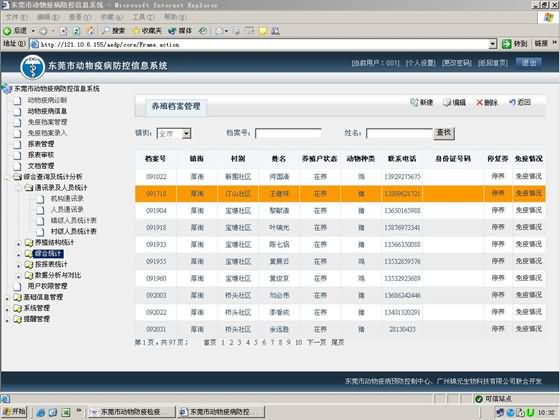 (一)打造東莞市動(dòng)物疫病防控信息系統(tǒng)。2006年該中心啟用了“東莞市動(dòng)物防疫檢疫管理系統(tǒng)”,首創(chuàng)使用智能IC卡對(duì)全市畜禽免疫情況進(jìn)行實(shí)時(shí)監(jiān)控,能實(shí)時(shí)全面反映全市動(dòng)物的養(yǎng)殖情況和防疫動(dòng)態(tài)狀況;2011年對(duì)該系統(tǒng)進(jìn)行了升級(jí)改造,建成了“東莞市動(dòng)物疫病防控信息系統(tǒng)”,新增了獸醫(yī)技術(shù)知識(shí)查詢、動(dòng)物疫病診斷、動(dòng)物防疫管理、統(tǒng)計(jì)分析、養(yǎng)殖場(chǎng)排污及無(wú)害化管理、全市防疫隊(duì)伍信息管理等功能,建立了系統(tǒng)、完整的全市疫病防控技術(shù)信息數(shù)據(jù)庫(kù),對(duì)防控信息查詢、防控技術(shù)咨詢、防控動(dòng)態(tài)分析、疫情預(yù)警發(fā)揮了重要作用,對(duì)防疫管理、隊(duì)伍管理、無(wú)害化處理管理等實(shí)行信息化管理。該系統(tǒng)曾獲東莞市科技進(jìn)步一等獎(jiǎng)和省農(nóng)業(yè)技術(shù)推廣三等獎(jiǎng),在國(guó)內(nèi)同行處于先進(jìn)水平。在此基礎(chǔ)上,配套使用了“防疫物資冷鏈管理系統(tǒng)”和“速達(dá)倉(cāng)庫(kù)進(jìn)銷存管理系統(tǒng)”對(duì)疫苗、檢測(cè)試劑進(jìn)行信息化管理,能隨時(shí)查詢疫苗等防疫物資的采購(gòu)、發(fā)放、庫(kù)存數(shù)量以及保管溫度等信息,實(shí)時(shí)掌握全市疫苗庫(kù)存、使用及需求動(dòng)態(tài)。