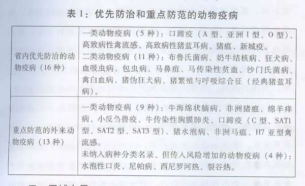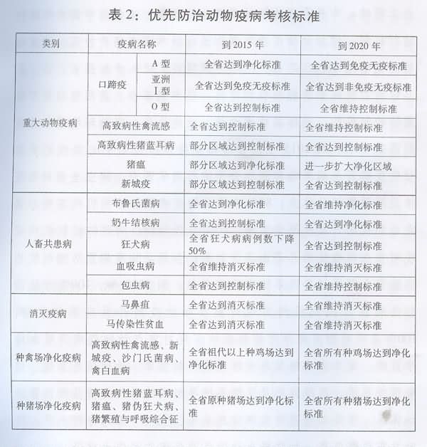 (二)防治目標(biāo)。到2020年,形成與全面建設(shè)小康社會相適應(yīng),有效保障養(yǎng)殖業(yè)生產(chǎn)安全、動物產(chǎn)品質(zhì)量安全和公共衛(wèi)生安全的動物疫病綜合防治能力。口蹄疫、高致病性禽流感等16種優(yōu)先防治動物疫病(表1)達(dá)到規(guī)劃設(shè)定的考核標(biāo)準(zhǔn)(表2),生豬、家禽、牛、羊發(fā)病率分別下降到5%、6%、4%、3%以下,動物發(fā)病率、死亡率和公共衛(wèi)生風(fēng)險(xiǎn)顯著降低。牛海綿狀腦病、非洲豬瘟等13種重點(diǎn)防范的外來動物疫病(表1)傳入和擴(kuò)散風(fēng)險(xiǎn)有效降低,防范和處置能力明顯提高。鴨瘟、小鵝瘟、豬乙型腦炎等動物疫病防控工作得到切實(shí)加強(qiáng)。