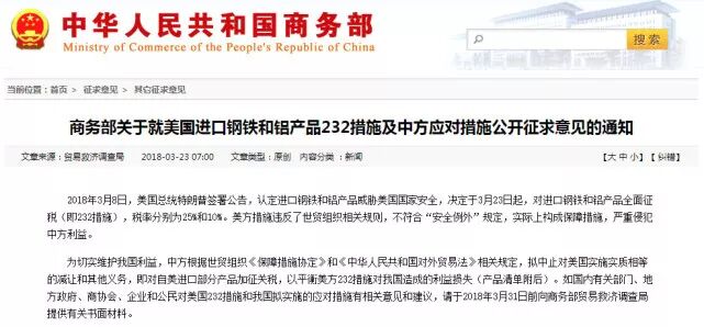 2018年3月23日,商務(wù)部發(fā)布了針對美國進(jìn)口鋼鐵和鋁產(chǎn)品232措施的中止減讓產(chǎn)品清單并征求公眾意見,擬對自美進(jìn)口部分產(chǎn)品加征關(guān)稅,以平衡因美國對進(jìn)口鋼鐵和鋁產(chǎn)品加征關(guān)稅給中方利益造成的損失。商務(wù)部新聞發(fā)言人就此發(fā)表談話。