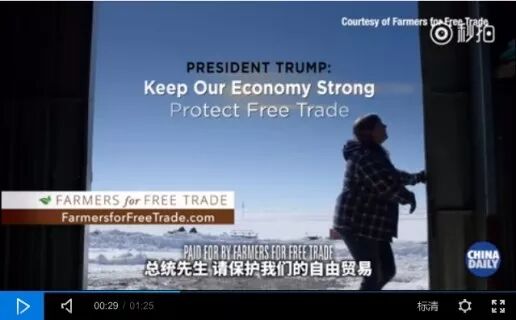 廣告中,農(nóng)民們表達(dá)了對特朗普貿(mào)易政策的擔(dān)憂。“我們依靠自由貿(mào)易政策來維持出口市場”,“貿(mào)易戰(zhàn)可能引發(fā)針對農(nóng)民的報(bào)復(fù)行為,農(nóng)業(yè)設(shè)備和成品價(jià)格將因此提高”,“當(dāng)美國與貿(mào)易伙伴針鋒相對時(shí),農(nóng)民付出了代價(jià)”。