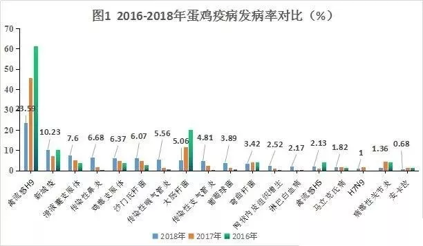 我們通過近三年疫病發病概況分析,可以看到部分疫病發病情況,通過數據了解三年來蛋雞疫病發病率差異及趨勢。圖1為2016年到2018年間蛋雞部分疫病發病率對比:
