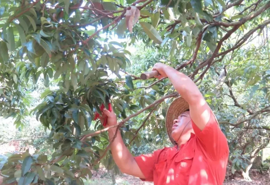 廖慶華表示,疏枝是荔枝管理最繁重的工作。“很多荔枝種植戶都只會疏枝一次,但是我對多數果樹會疏枝兩次。好處就是可以更好調節秋梢的生長,還可以對荔枝的成熟時間進行一定的間隔。”廖慶華簡單介紹道,假如荔枝生長期是一個恒定時長,那么早開花的就會早成熟,晚開花的就會晚成熟。疏枝兩次就是為了放兩次秋梢,使秋梢的生長有先后,從而使其開花也有先后。因此,采摘后疏枝很重要。