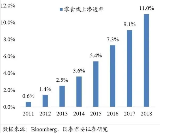 但生鮮、零食等品類因為非標以及體驗感重要的原因,線上滲透率仍不高,目前均在 11%左右。疫情影響下,全國人民居家,但生鮮等必需品不可缺少,將推動線上滲透率的快速提升,未來憑借方便快捷品質好等優勢,線上渠道的認可度和使用度也將持續提升。