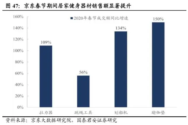 疫情下戶外運動受限使得居家健身器材銷售同比顯著提升, 京東消費大數據顯示,春節期間京東平臺拉力器成交額同比增長109%, 跳繩成交額同比增長 56%,劃船機成交額同比增長 134%,2 月上旬京東 自營瑜伽墊成交額同比增長近 6 倍,不受場地限制的健身器材成為了疫 情期間人們的熱門選擇,本次疫情有望促進運動裝備行業的發展。