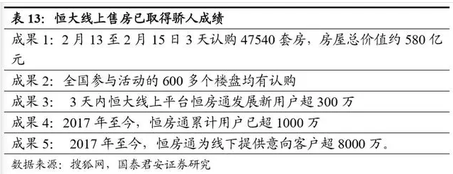 恒大集團于 2 月 13 日率先全面實施網上銷售,引入包括“24 小時在線看房”、“720°VR 實景展示”等模式,目前線上銷售可完成在線交材料、在線驗資、在線選房、在線交易等購房流程。短短三天時間,消費者認購恒大房屋 4.75 萬套,相當于房屋的總價值約 580 億元,全國 600 多個樓盤均有認購,其中最高的一個樓盤認購 870 套。