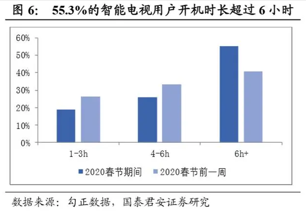 用戶回歸大屏,人均日收視時長增加。根據 CSM 數據,2020 年春節 7 天累計觀眾規模實現 10.32 億,占全國電視觀眾總人口的 80.6%,人均日收視時長從 2019 年春節的 164 分鐘增長至 2020 年春節的 194 分鐘, 同比增長 18.3%。