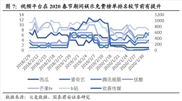 根據七麥數據,各視頻應用在 IOS 娛樂應用免費榜單的排名在 2020 年春節前后較 2019 年同期整體 都有不同程度的提升,從運營指標看,主要長視頻 APP 的用戶數、用戶 活躍度及使用時長均有明顯增加。