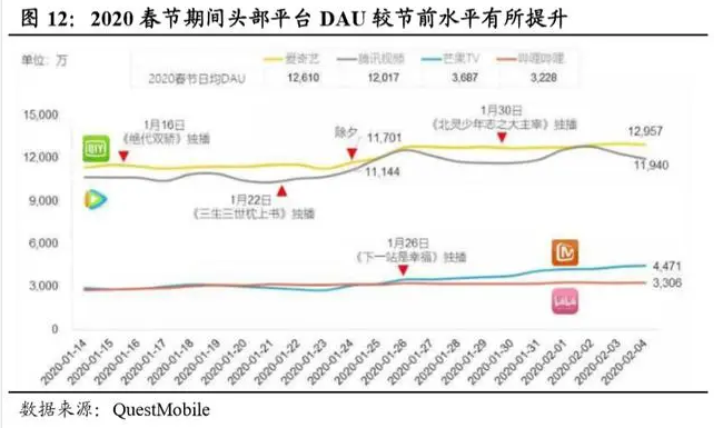 春節期間在線視頻行業用戶活躍,DAU 及使用時長均有顯著提升。