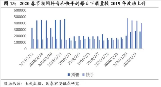 以抖音、快手為例,對比 2018 年至 2020 年正月初一 前后 4 天的 IOS 下載量數據,抖音在 2018 年春節前后 4 天的每日預估下載量維持在 300000 以上的高位?焓謩t是與 2020 春晚合作,直播期間發放 10 億現金紅包進行引流拉新,春晚直播間累計觀看人次達到 7.8 億。春節當天快手預估下載量突破 470000,截至 2020 年 1 月 29 日預估 下載量水平仍然維持在高位。2019 年春節期間短視頻整體每日預估下載量較 2018 年有所下降,2020 年春節期間再次波動上升。