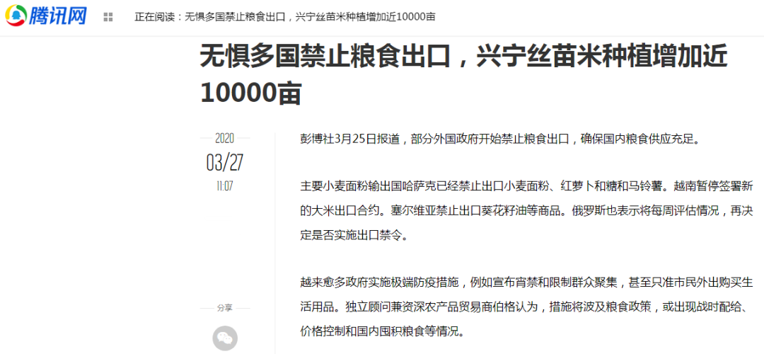 疫情的蔓延還使全球糧食供應鏈面臨巨大壓力。一些糧食出口國為求自保,紛紛出臺限制甚至禁止糧食出口政策。越南率先宣布停止大米出口;稻米出口國印度也因為“封國”而陷入停滯;小麥出口國俄羅斯也隨后限制了出售。