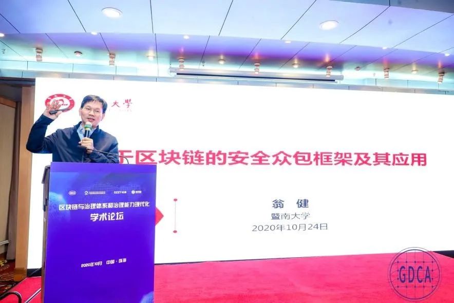 在主題分享環(huán)節(jié),首先由暨南大學(xué)副校長翁健教授作了“基于區(qū)塊鏈的安全眾包框架”分享,他在主題分享中提出了一種基于區(qū)塊鏈技術(shù)的眾包框架CrowdBC,構(gòu)建了基于兩方模型的安全眾包架構(gòu),利用區(qū)塊鏈技術(shù)來建立發(fā)布者和工作者之間的互信,結(jié)合智能合約、密碼協(xié)議等技術(shù)來支撐眾包任務(wù)及數(shù)據(jù)的管理,不僅提升了眾包系統(tǒng)的安全性,同時(shí)可以有效緩解傳統(tǒng)眾包服務(wù)費(fèi)用高的問題。
