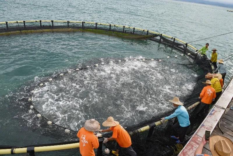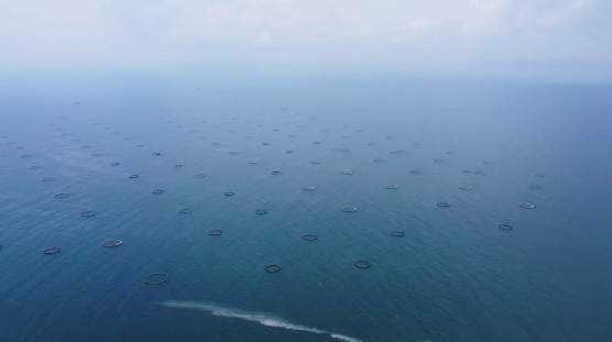 廣東陽江市大鑊島深海網箱養殖基地,100多口周長60米的大網箱鑲嵌在蔚藍的大海上,蔚為壯觀。