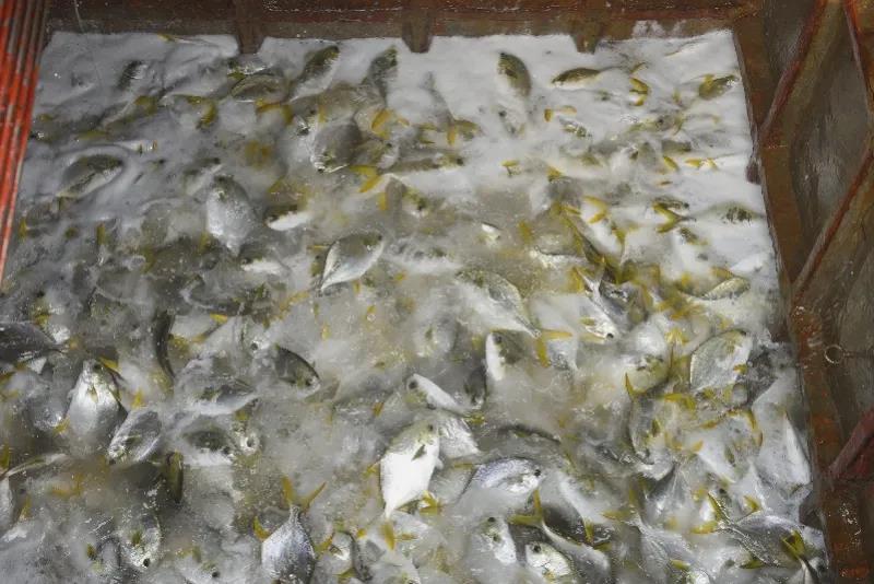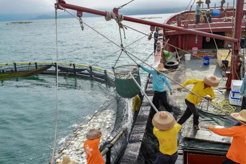 近日,廣東省陽江市深海網箱養殖產業園大鑊島深海網箱養殖基地首批過冬商品魚捕撈上市。拉網、裝筐、吊裝……僅用了30多分鐘,2萬多斤肥美的金鯧魚便被順利裝進船艙。這些魚將被運回碼頭,再轉冷凍貨柜車送到批發市場銷售。