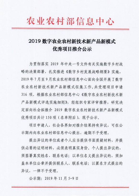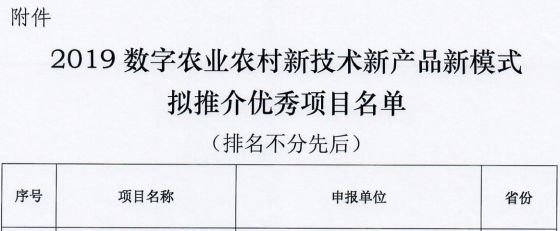 近日,農業農村部信息中心發布《2019數字農業農村新技術新產品新模式優秀項目推薦公示》。據悉,農業農村部信息中心共受理項目申請316項,經組織專家評審推薦,研究決定面向社會擬推介優秀項目共計150項。