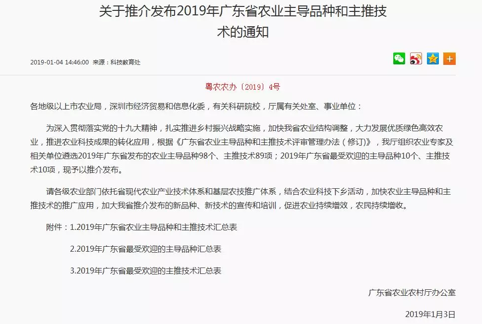 1月4日,廣東省農業農村廳發布《關于推介發布2019年廣東省農業主導品種和主推技術的通知》。榜單上,由廣東省現代農業裝備研究所主導,省農裝所下屬健坤網絡公司參與研究開發的三項技術榜上有名,分別是: