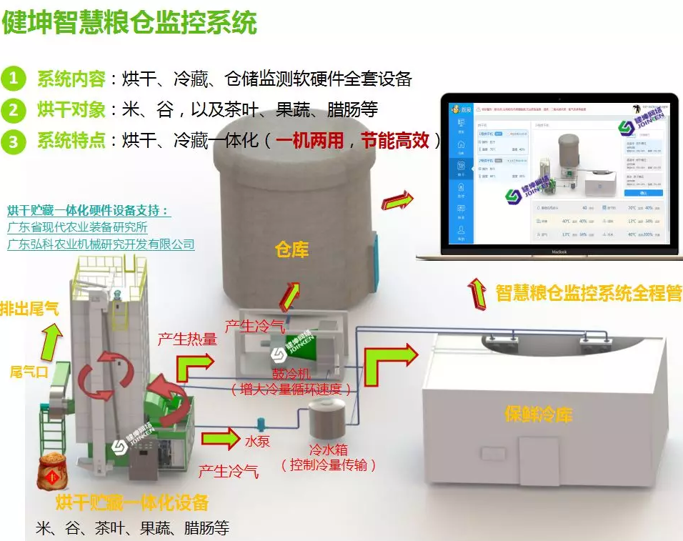 結合省農裝所和廣東弘科的烘干貯藏一體化硬件設備,健坤公司自主研發了一整套智慧糧倉監測與控制系統。2019年在荔泉食品、興寧現代糧食產業示范區建設中得到良好應用。