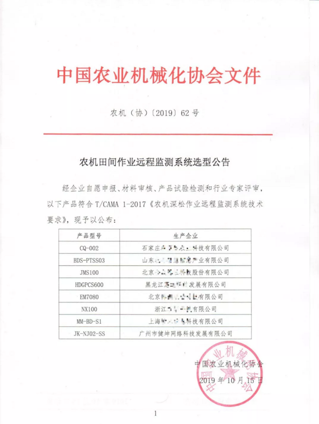 10月15日,中國農業機械化協會發布《農機田間作業遠程監測系統選型公告》,符合T/CAMA 1-2017《農機深松作業遠程監測系統技術要求》的產品型號共8個,其中健坤公司JK-NJ02-SS農機智能監測終端是廣東首個入選農機田間作業遠程監測系統推薦名單的產品。