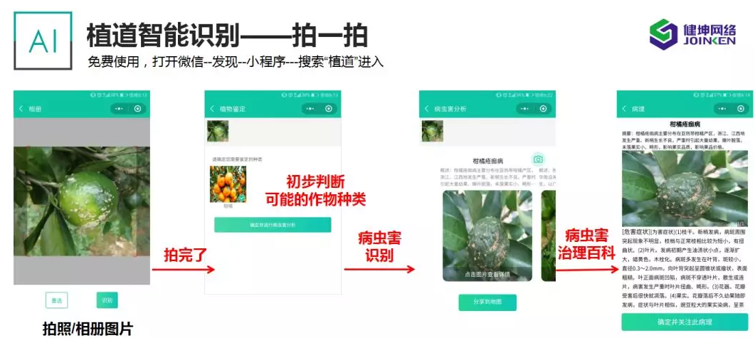 “植道”是健坤公司開發的一款微信小程序,把AI人工智能技術帶到農業應用領域,讓農業人通過微信中的“應用程序”就能解決病蟲害困擾,協助整個社會從容應對面對快速的增長人口和食安問題的挑戰。