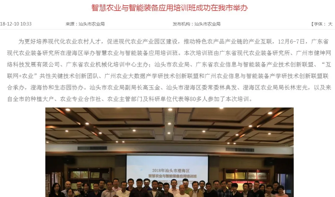 4月10日,汕頭澄海協和生態園隆重舉行了"智慧養豬實訓基地"揭牌儀式,澄海區委常委林典發先生、協和房地產開發有限公司董事長唐兩松先生、省農裝所技術工程師、健坤網絡技術工程師代表等人為基地正式揭牌,澄海區電視臺跟蹤報道。