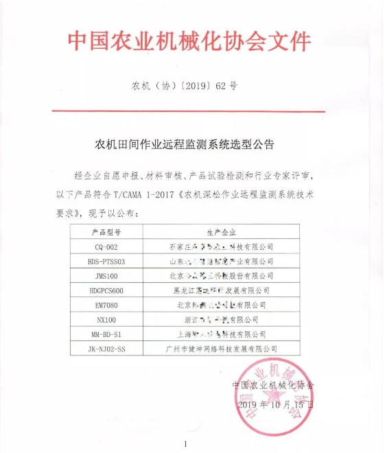 2019年,健坤公司JK-NJ02-SS農機作業監測終端,成為華南地區首個入選農機田間作業遠程監測系統推薦名單的產品。