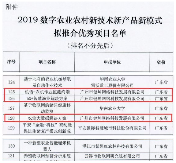 2019年,健坤公司的“機語-農機作業監測終端”,與“5G+智慧漁業解決方案”和“農業大數據解決方案”,一同上榜農業農村部的《2019數字農業農村新技術新產品新模式優秀項目》。
