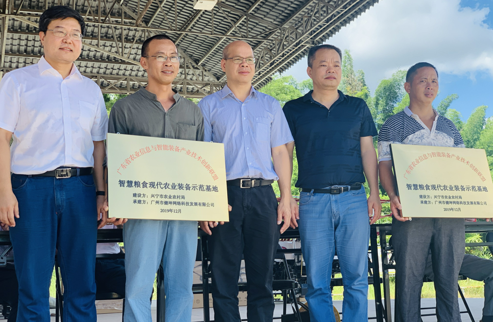 由廣東省農業農村廳農業機械化管理處調研員梁曉明、廣東省農機試驗鑒定站站長陳永志分別為興寧市潤豐農業專業合作社、興寧市辰興種糧專業合作社進行智能農機裝備示范基地授牌。