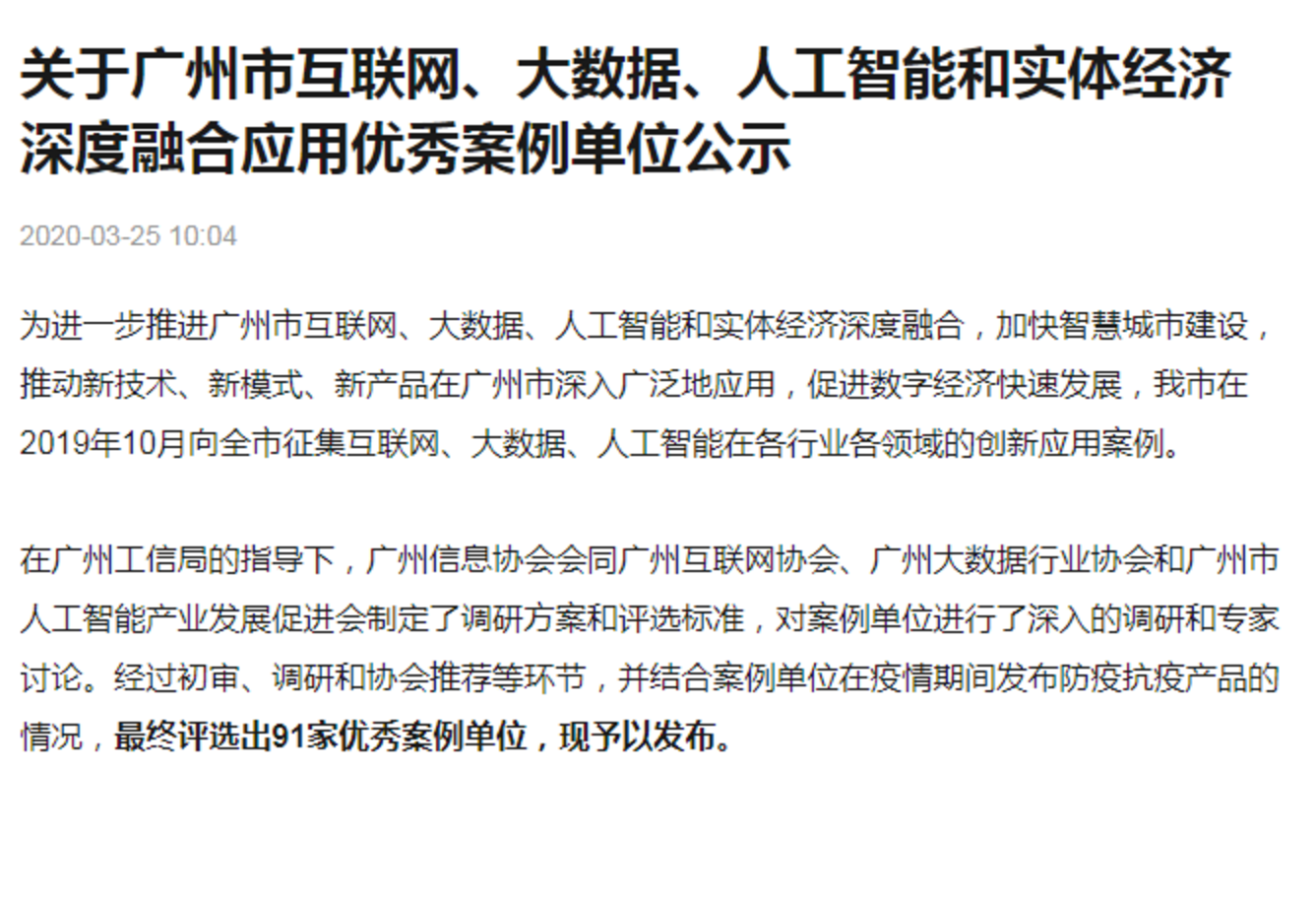 廣州健坤公司獲評“廣州市互聯網、大數據、人工智能和實體經濟深度融合應用優秀案例單位”。