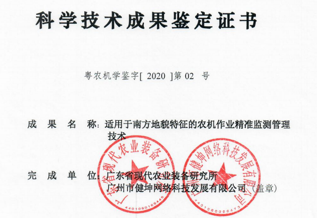 廣州健坤公司研發的“適用于南方地貌特征的農機作業精準監測管理技術”通過廣東省農業機械學會鑒定委員會鑒定,整體技術達到國內領先水平。