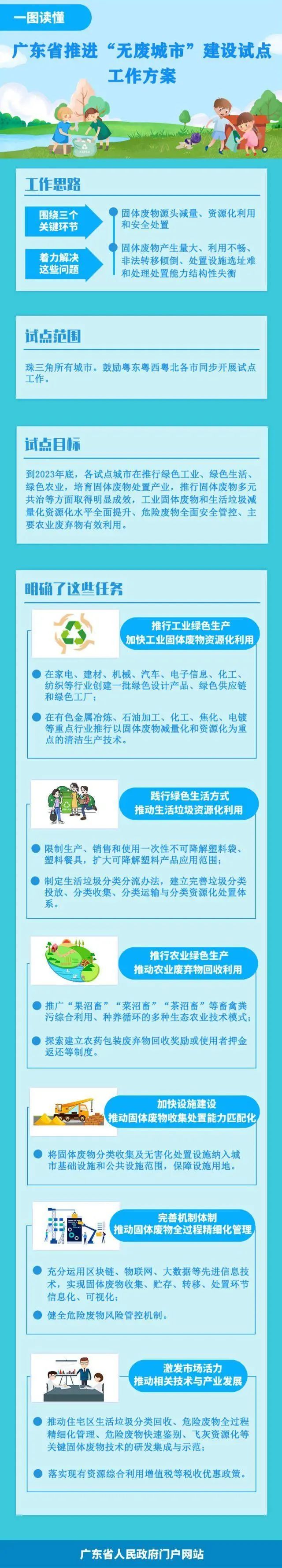 “無廢城市”建設試點,主要任務包括:推行工業綠色生產,加快工業固體廢物資源化利用;踐行綠色生活方式,推動生活垃圾資源化利用;推行農業綠色生產,推動農業廢棄物回收利用;加快設施建設,推動固體廢物收集處置能力匹配化;完善機制體制,推動固體廢物全過程精細化管理;激發市場活力,推動相關技術與產業發展等六方面。