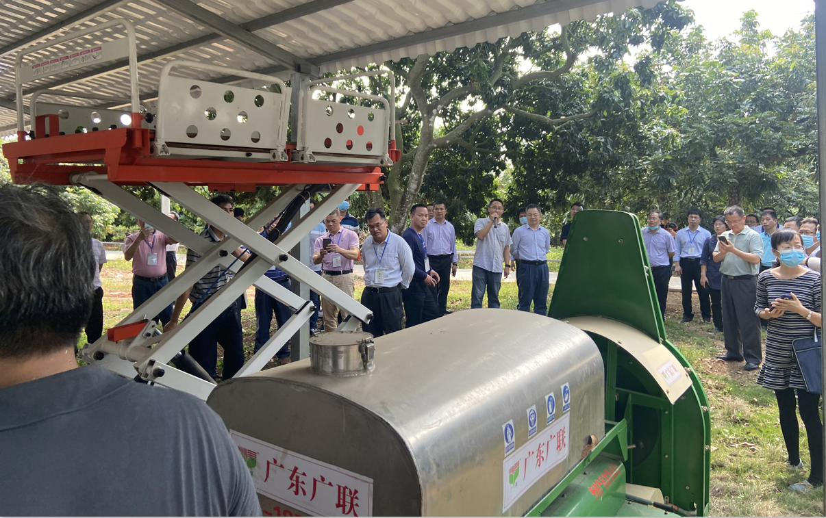 在智慧果園,工作人員演示高架作業(yè)機運行使用,培訓班成員紛紛圍觀拍照。該款作業(yè)機升降控制簡單,還可調(diào)節(jié)工作臺的平衡性,在荔枝樹修剪和采摘等工作中極大提升了作業(yè)人員的安全。“廣東有非常多荔枝大樹和古樹,采摘難度相較于海南等產(chǎn)區(qū)大,這款機器在廣東荔枝產(chǎn)業(yè)能發(fā)揮較大的作用。”培訓班成員對高架作業(yè)機高度認可。