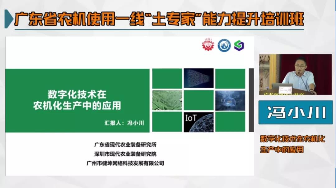 廣州市健坤網絡科技發展有限公司馮小川工程師為學員帶來主題報告《數字化技術在農機化生產中的應用》,呈現農機化與數字化融合的多場景應用,包括農機社會化服務、智能農機創新應用、茶葉加工全過程智能化、智慧設施農業、病蟲害防治預警等應用領域。