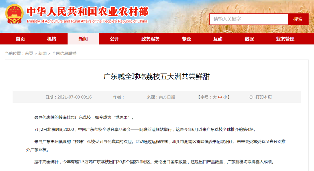 擴大國際市場傳播途徑。組建了全國最大的荔枝出口集團——中荔集團,積極培育出口示范基地和出口企業,發起“廣東喊全球吃荔枝”、“廣東荔枝”在全球核心城市“亮屏”等營銷活動。2020年首次出口智利,實現了鮮荔枝出口南美洲的“零突破”;2021年廣東荔枝出口6大洲的20多個國家和地區。