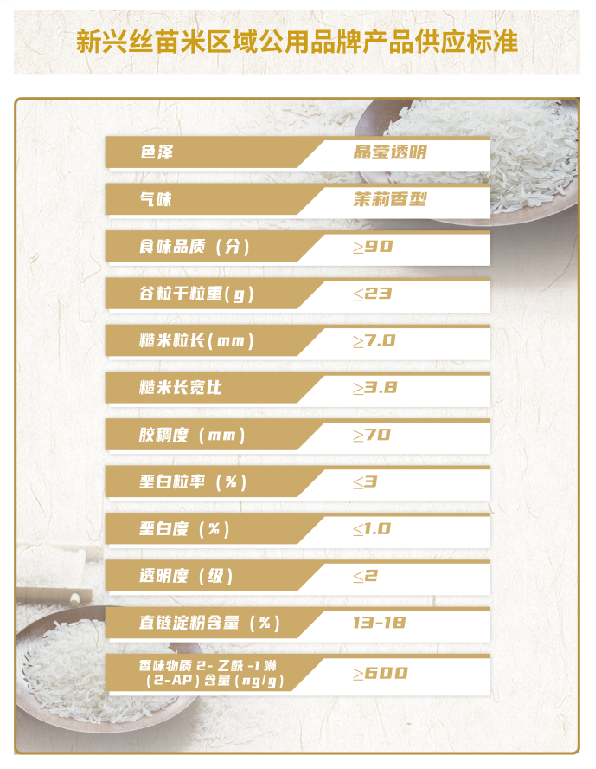新興絲苗米作為新興縣重點(diǎn)打造的農(nóng)產(chǎn)品區(qū)域公用品牌,在2021年豐收節(jié)上發(fā)布了新興絲苗米品牌標(biāo)識(shí)以及產(chǎn)品供應(yīng)標(biāo)準(zhǔn),新興絲苗米在廣東絲苗米標(biāo)準(zhǔn)的基礎(chǔ)上形成更高等級(jí)的標(biāo)準(zhǔn)體系,更全國(guó)首創(chuàng)添加香氣指標(biāo)作為核心指標(biāo),通過更高的標(biāo)準(zhǔn),對(duì)絲苗米優(yōu)中選優(yōu),實(shí)現(xiàn)優(yōu)質(zhì)優(yōu)價(jià)。
