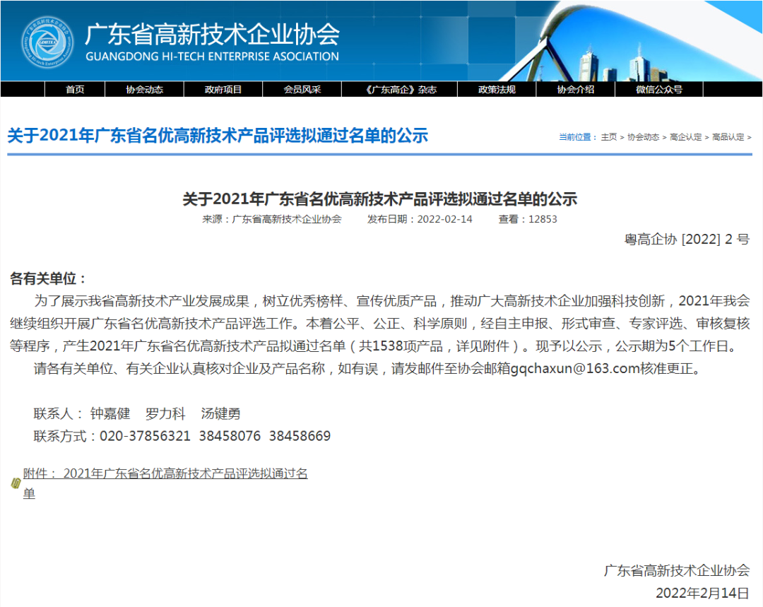 近日,廣東省高新技術協會公示了《2021年廣東省名優高新技術產品名單》。從公開媒體解讀獲悉,廣東省名優高新技術產品認證是原高新技術產品認證的延續和升級,其認定門檻大幅提高,申報難度加大,含金量高。