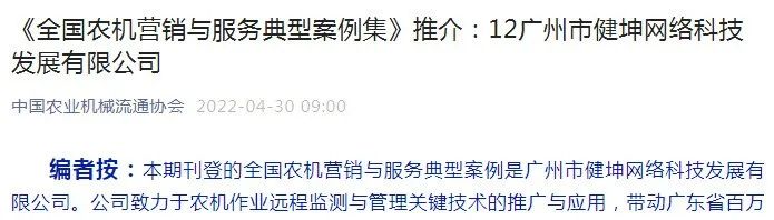 今日,小坤從中國(guó)農(nóng)業(yè)機(jī)械流通協(xié)會(huì)獲悉,協(xié)會(huì)于今年五一勞動(dòng)節(jié)前夕刊登我司農(nóng)業(yè)社會(huì)化服務(wù)典型案例,面向全國(guó)推廣“健坤模式”。回顧該典型案例全文,健坤公司以“農(nóng)機(jī)信息化大數(shù)據(jù)”和“北斗農(nóng)機(jī)作業(yè)遠(yuǎn)程監(jiān)測(cè)與管理關(guān)鍵技術(shù)”實(shí)踐經(jīng)驗(yàn)成為上榜的關(guān)鍵因素。