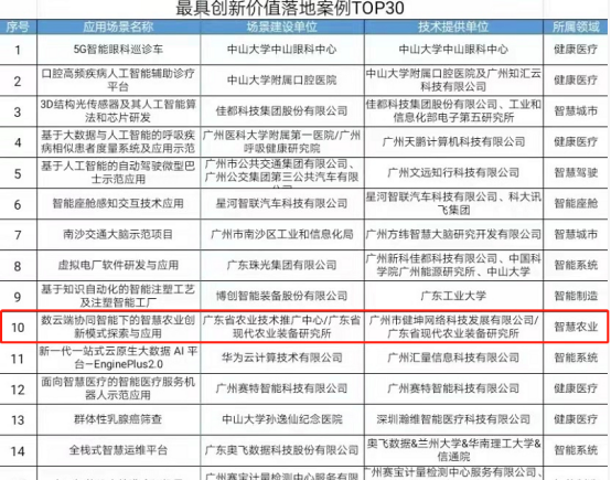 “智啟新動能 數造新優勢”。12月20日,“2022廣州人工智能創新發展榜單發布會暨人工智能行業交流會”在線上成功召開,省農裝所健坤公司提供技術支持的“數云端協同智能下的智慧農業創新模式探索與應用”榮登廣州最具創新價值落地案例TOP10,是榜單上唯一的智慧農業創新模式案例。