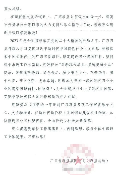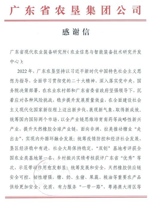 值此新春佳節到來之際,省農裝所信息中心(健坤公司)收到一封來自廣東省農墾集團公司(農墾總局)的感謝信。信中對我單位提供的數字農業與智能裝備服務給予高度肯定和贊賞,并盼望在新的一年里,繼續與我單位保持密切合作,一同為建設農業強國、加快推進農業農村現代化、全面推進鄉村振興新篇章做出更大的貢獻。