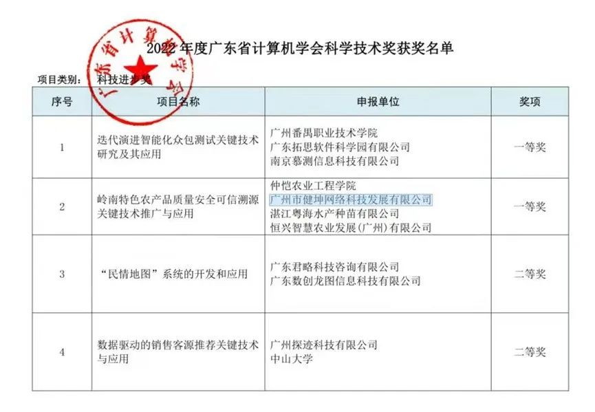 近日,2022年度廣東省計算機學會科學技術獎、優秀論文獎評選結果公布,由仲愷農業工程學院、廣州市健坤網絡科技發展有限公司、湛江粵海水產種苗有限公司、恒興智慧農業發展(廣州)有限公司等單位共同完成的“嶺南特色農產品質量安全可信溯源關鍵技術推廣與應用”項目在眾多優秀參評企業、院校中脫穎而出,突破重圍,斬獲科學技術獎一等獎,獲得了業內專家的高度肯定。